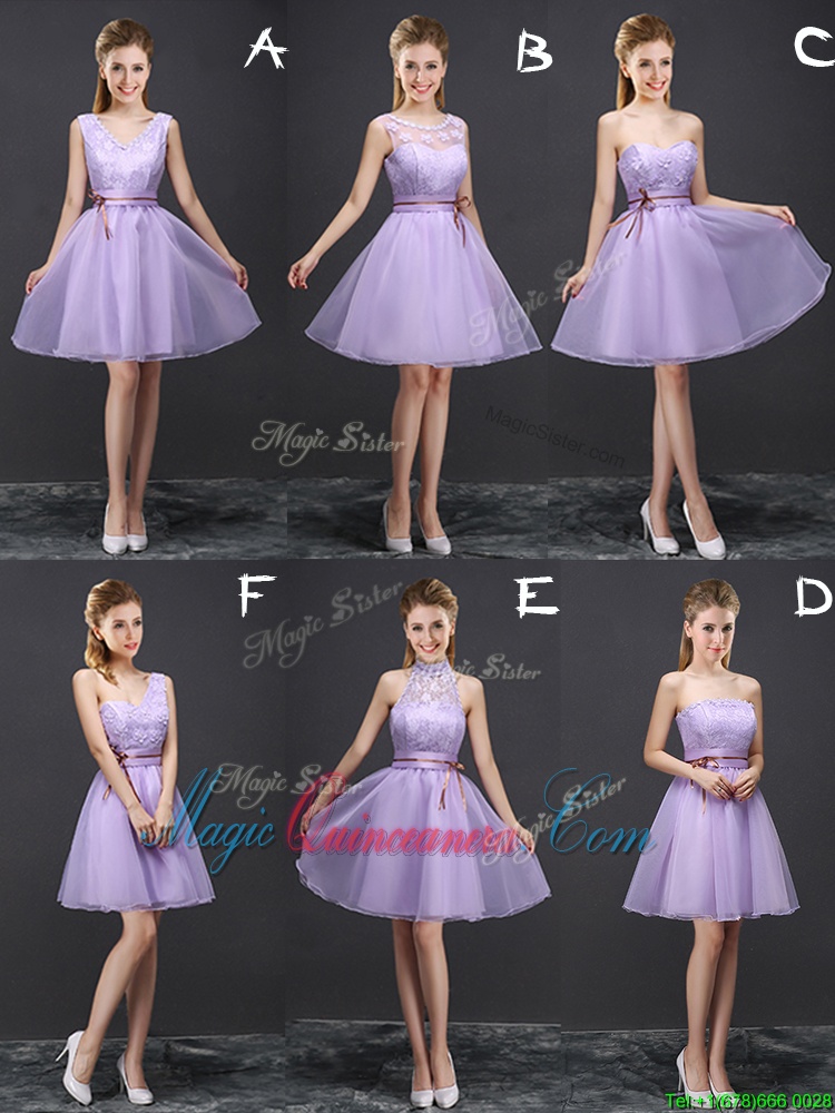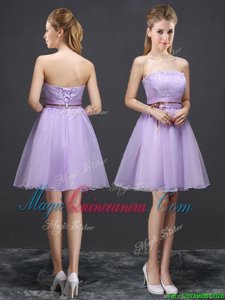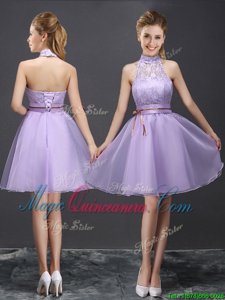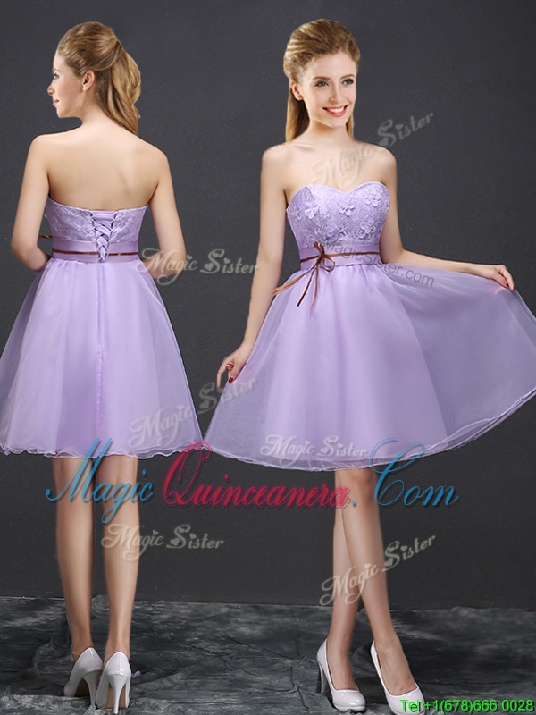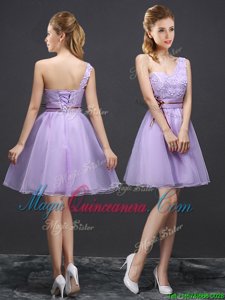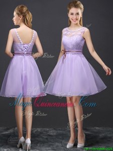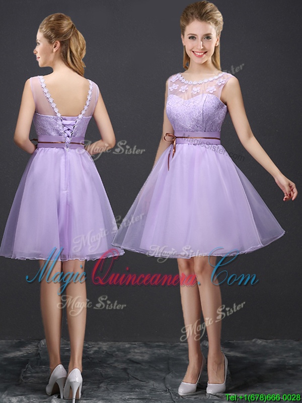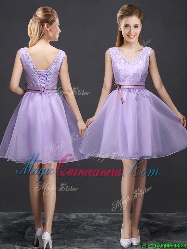 , Organza V-neck Sleeveless Lace Up Lace and Appliques and Belt Quinceanera Court of Honor Dress in Lavender