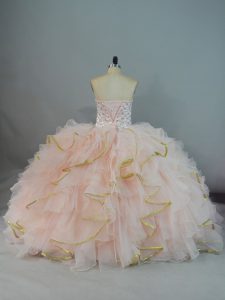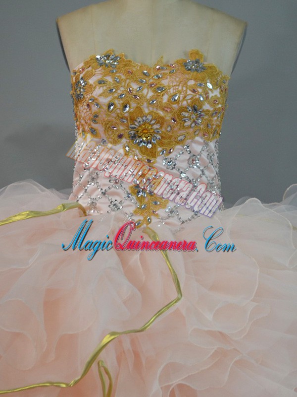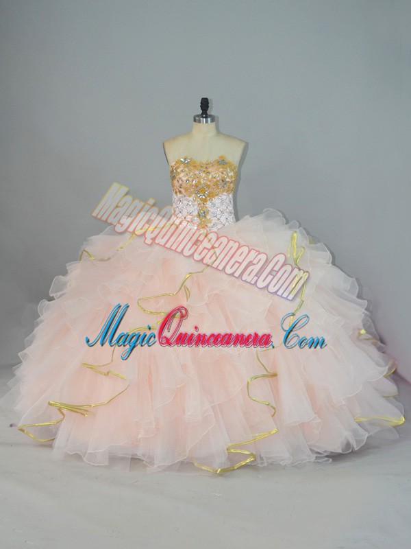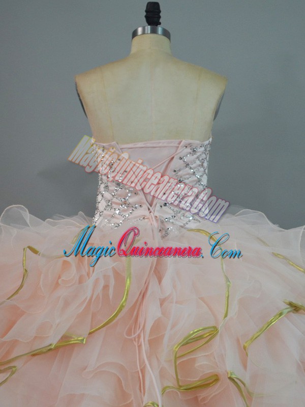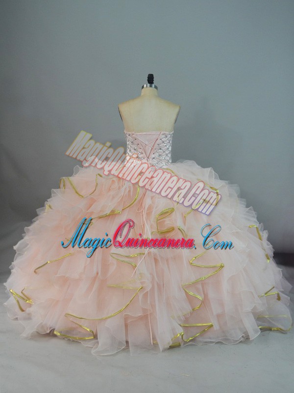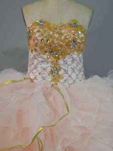 Peach Ball Gowns Beading and Ruffles Quinceanera Dress Lace Up Organza Sleeveless Floor Length