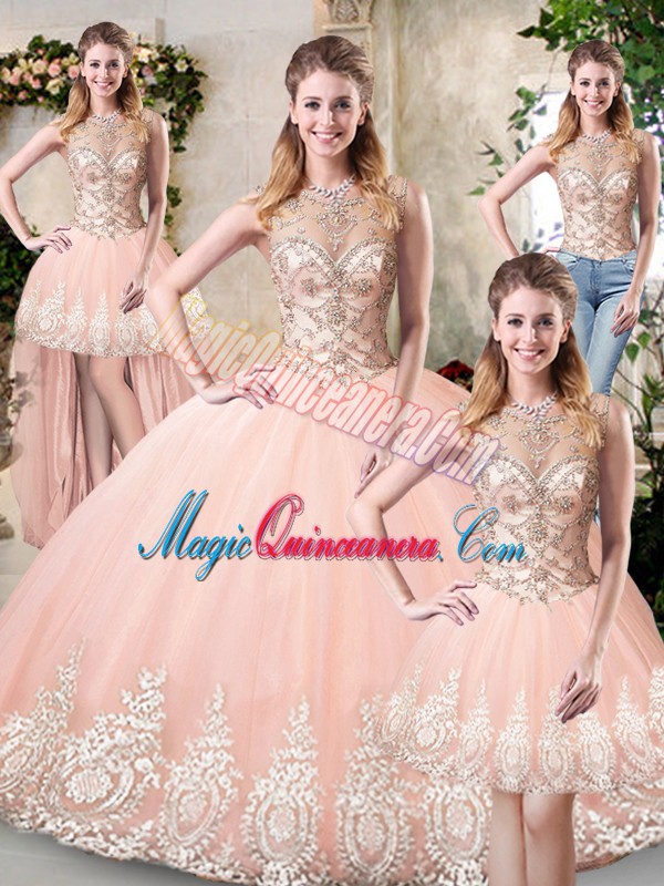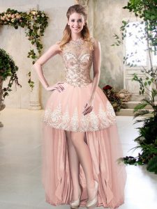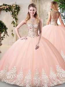 Peach High-neck Neckline Beading and Lace and Appliques Ball Gown Prom Dress Sleeveless Backless
