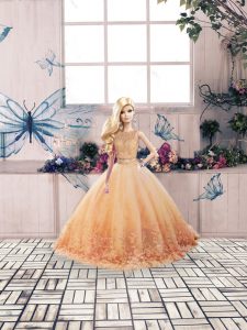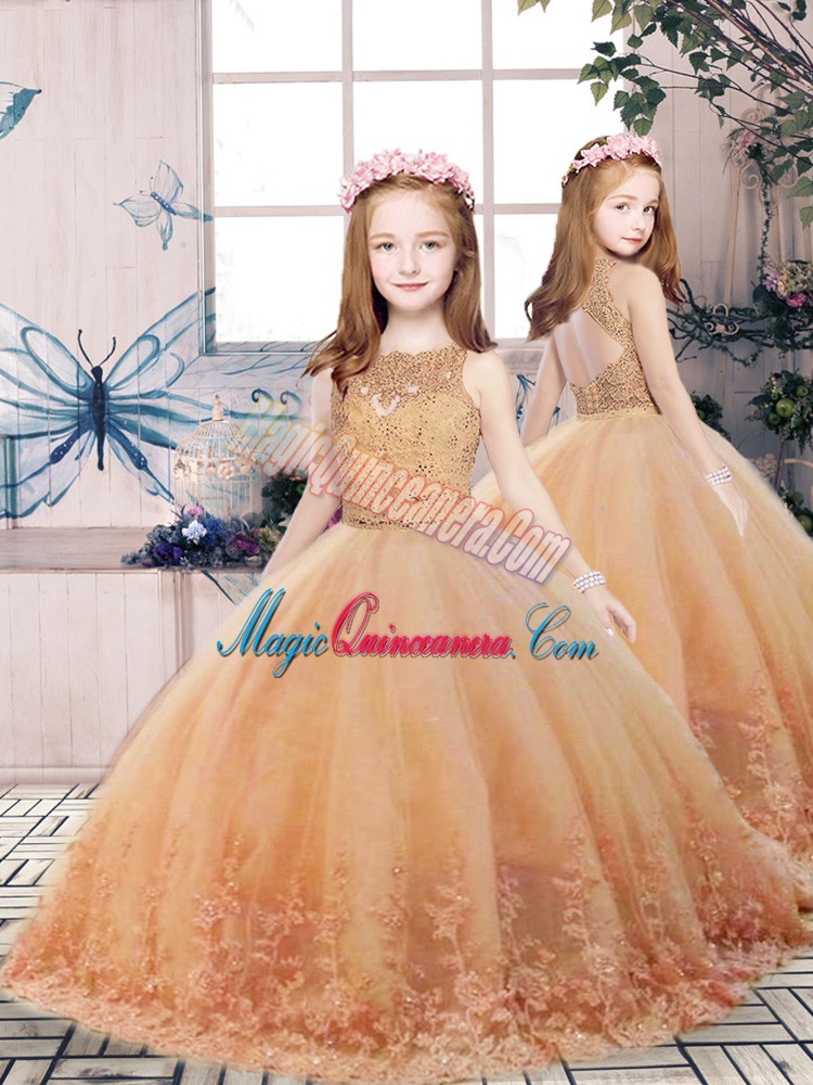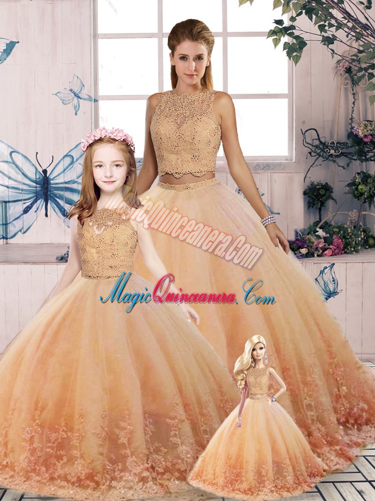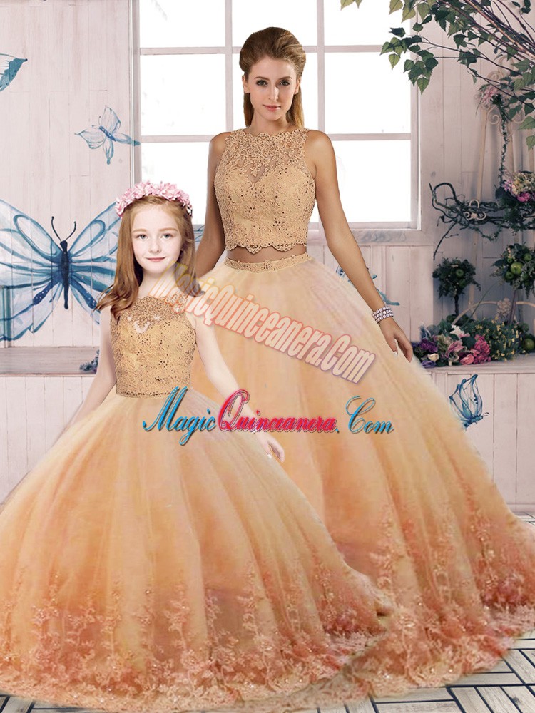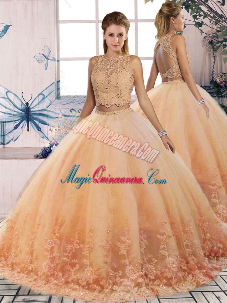 Peach Scalloped Backless Lace Quince Ball Gowns Sweep Train Sleeveless