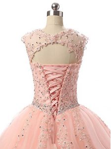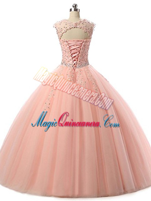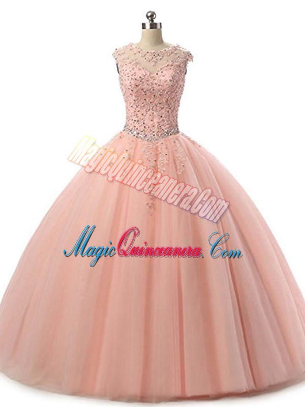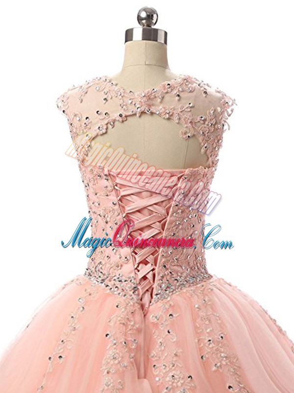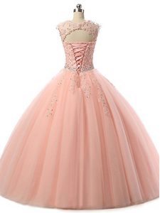 , Peach Scoop Lace Up Beading and Lace Sweet 16 Dresses Sleeveless