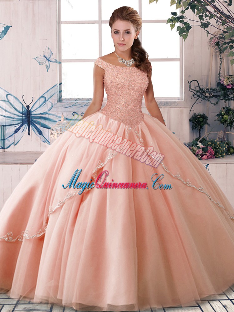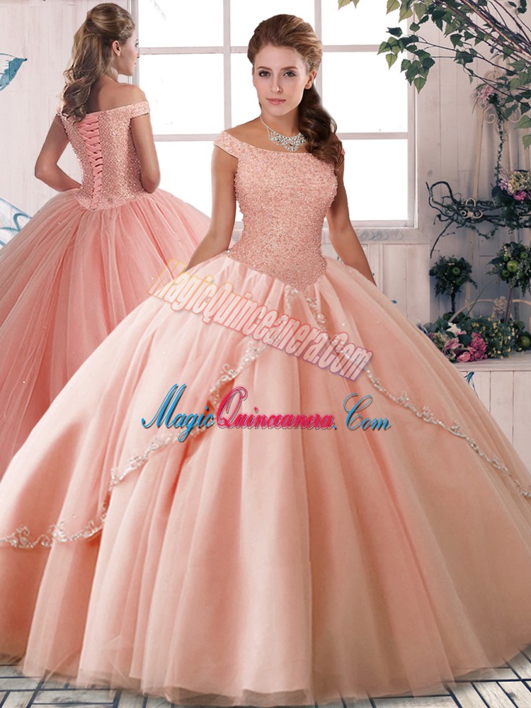 , Peach Tulle Lace Up Off The Shoulder Sleeveless Sweet 16 Dress Brush Train Beading