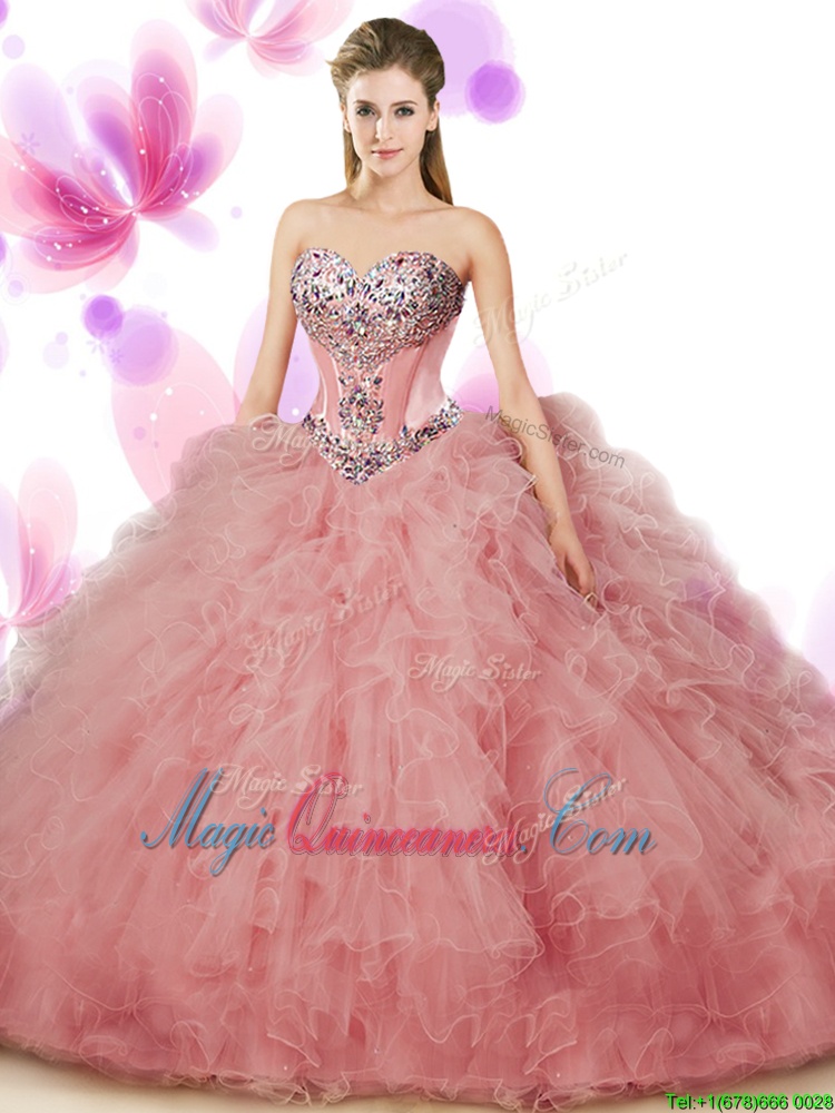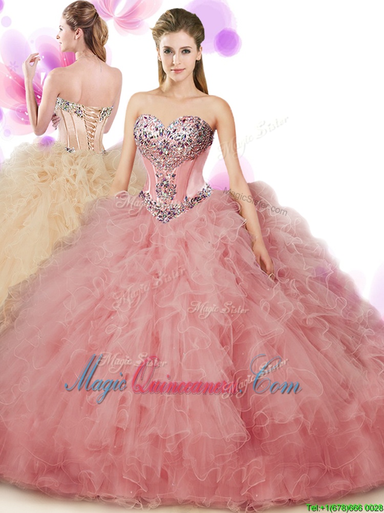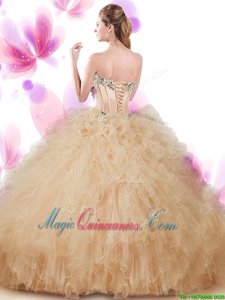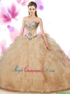 , Peach Tulle Lace Up Quinceanera Gown Sleeveless Floor Length Beading and Ruffles