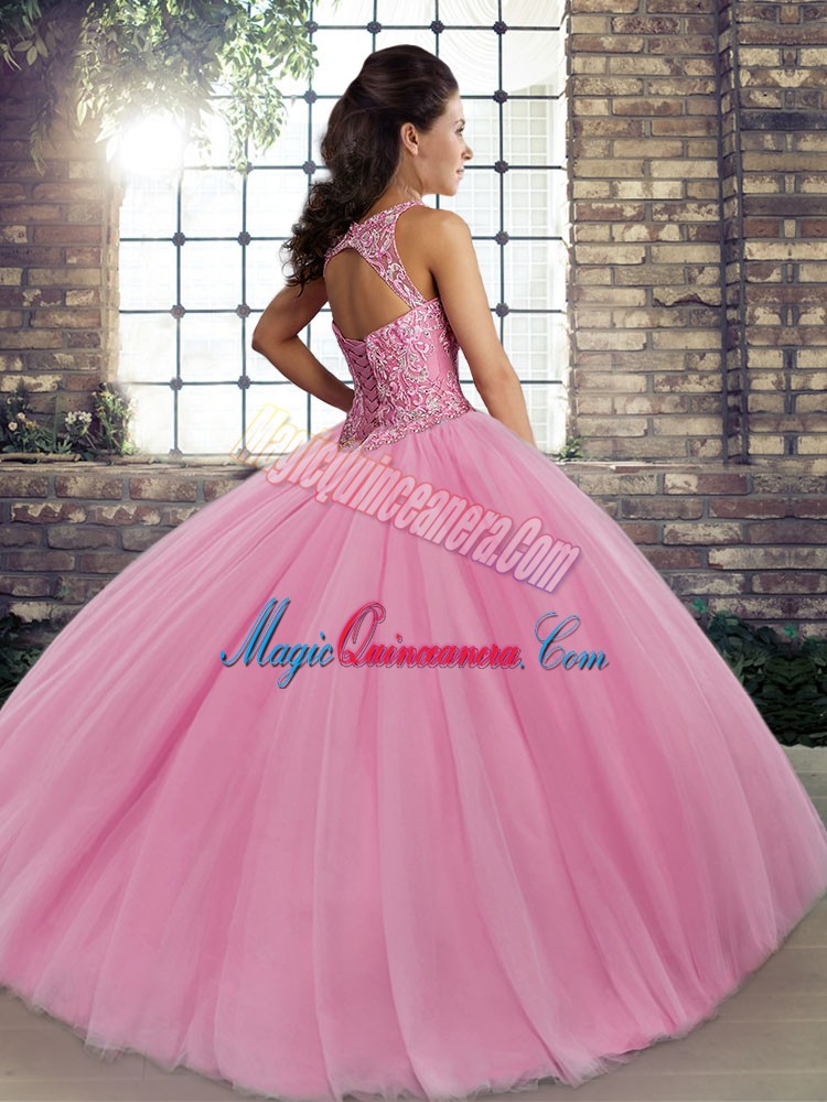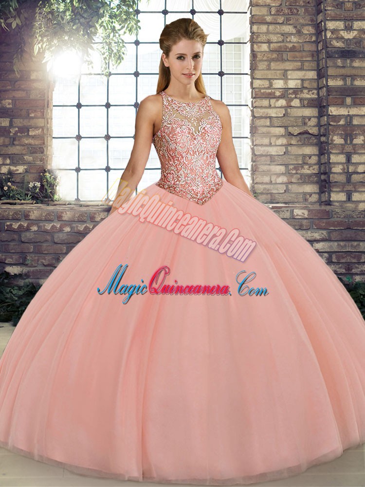 Peach Tulle Lace Up Scoop Sleeveless Floor Length Quinceanera Gown Embroidery
