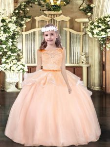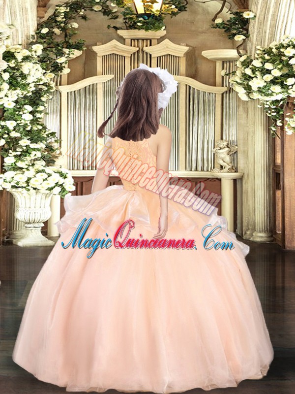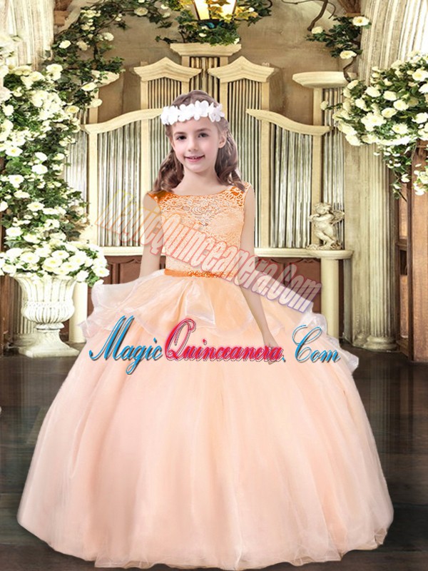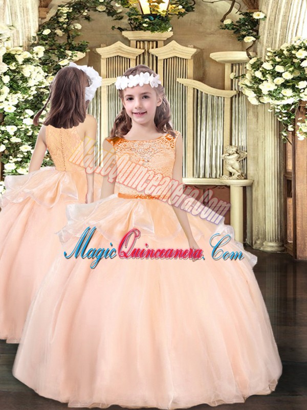 Peach Zipper Little Girl Pageant Dress Lace Sleeveless Floor Length