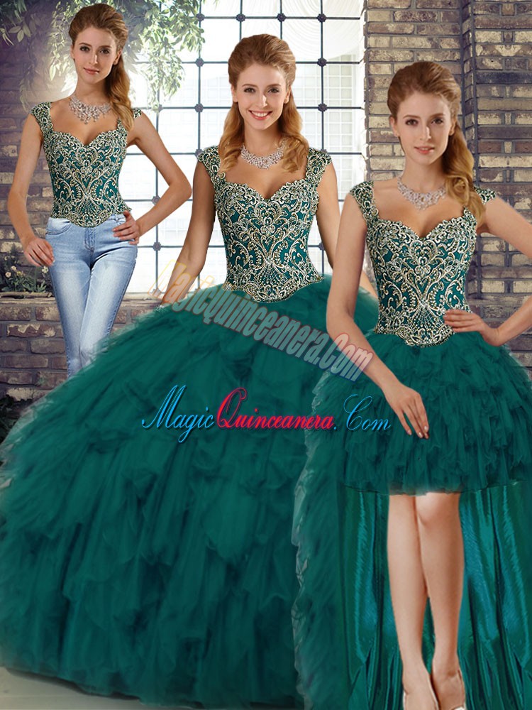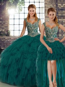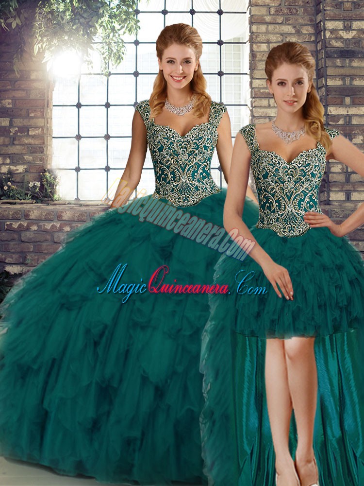 Peacock Green Sleeveless Floor Length Beading and Ruffles Lace Up 15th Birthday Dress