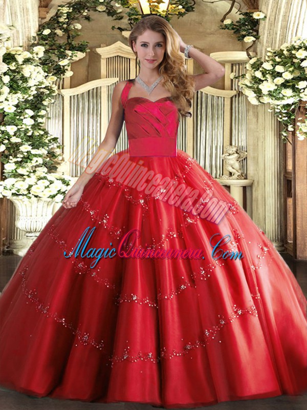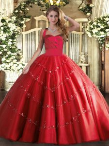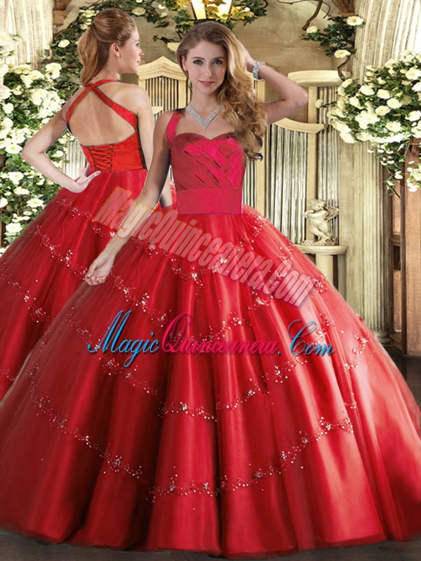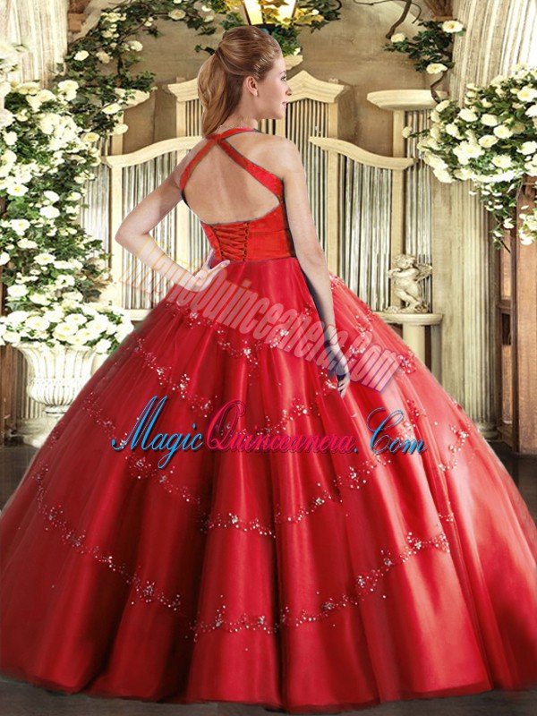 Perfect Red Halter Top Lace Up Appliques Quinceanera Gown Sleeveless