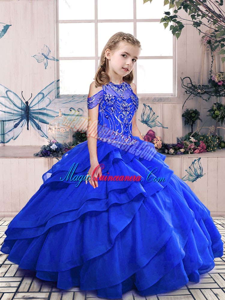 Perfect Royal Blue Ball Gowns Beading Pageant Dress Lace Up Organza Sleeveless Floor Length