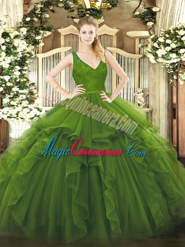 Perfect Sleeveless Organza Floor Length Zipper Quince Ball Gowns in Olive Green with Ruffles