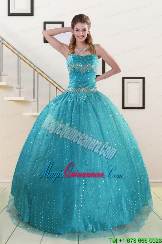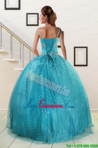 , Perfect Spaghetti Straps Appliques Sequins Turquoise Quinceanera Dresses for 2015