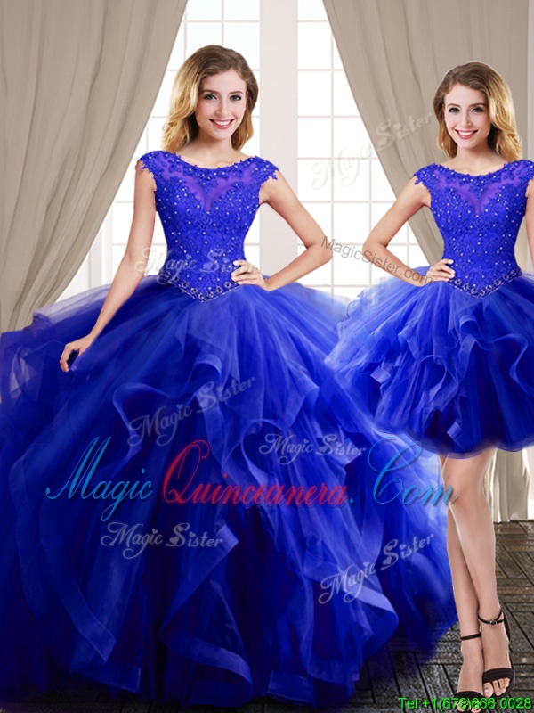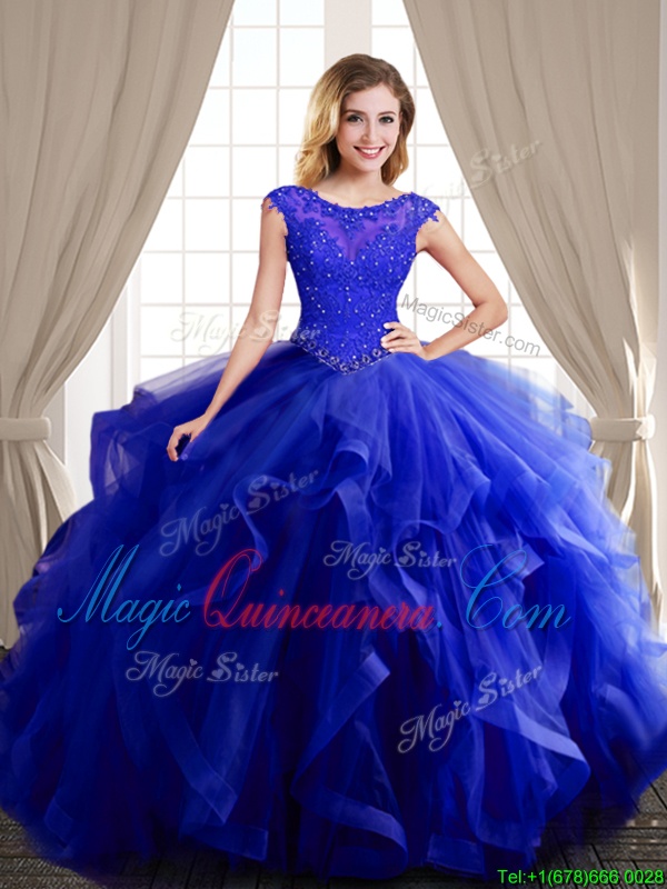 Perfect Three Piece Scoop Cap Sleeves Brush Train Lace Up Sweet 16 Dresses Royal Blue Tulle