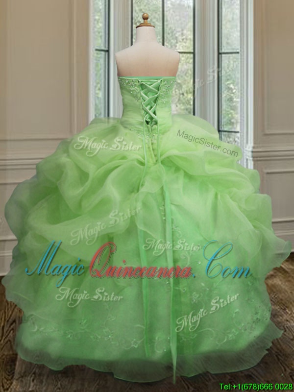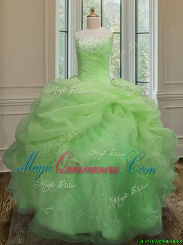 , Pick Ups Floor Length Ball Gowns Sleeveless Yellow Green Quince Ball Gowns Lace Up