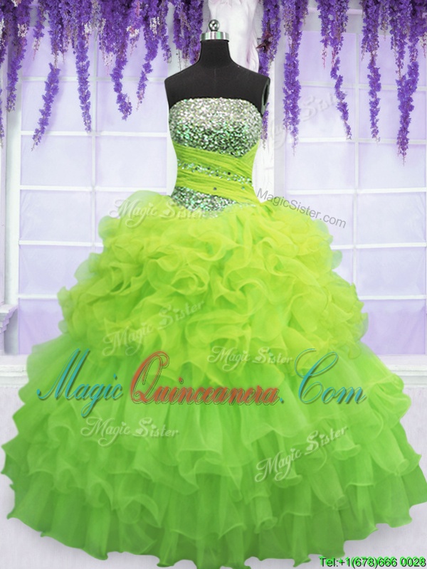 Pick Ups Ruffled Yellow Green Sleeveless Organza Lace Up Quinceanera Gowns for Military Ball and Sweet 16 and Quinceanera