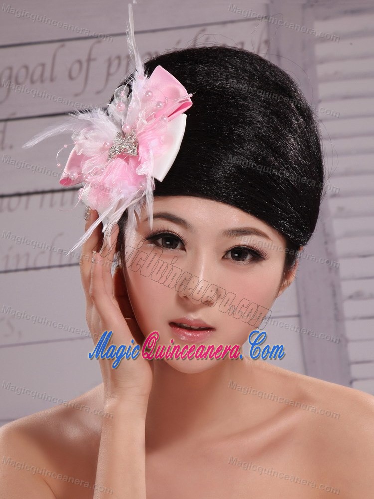 , Pink and White Satin Feather With Pearls Flowers For Party