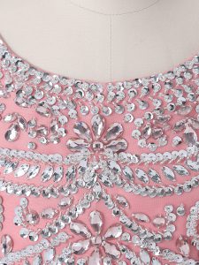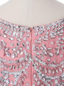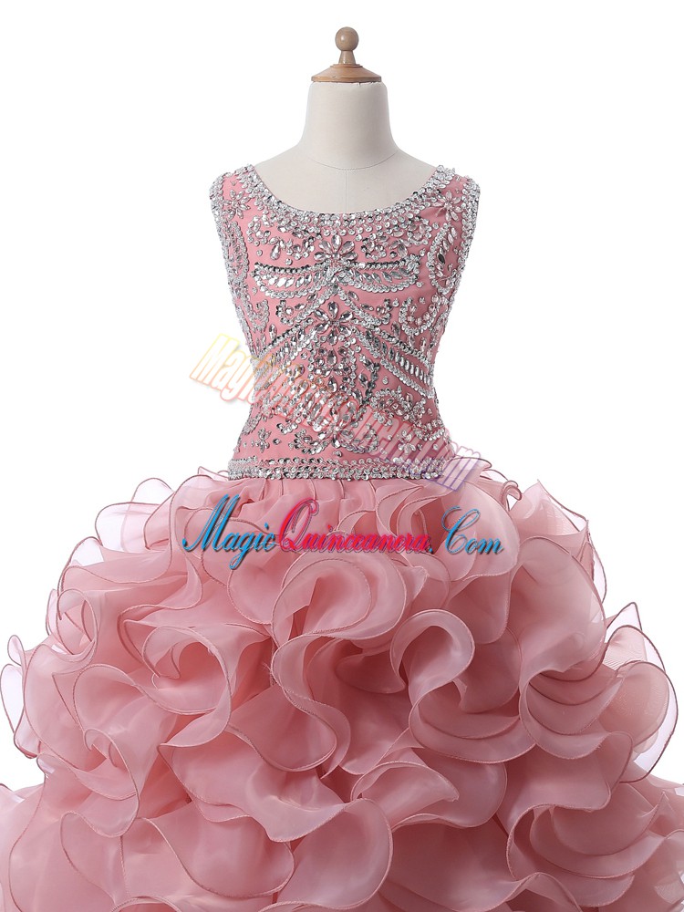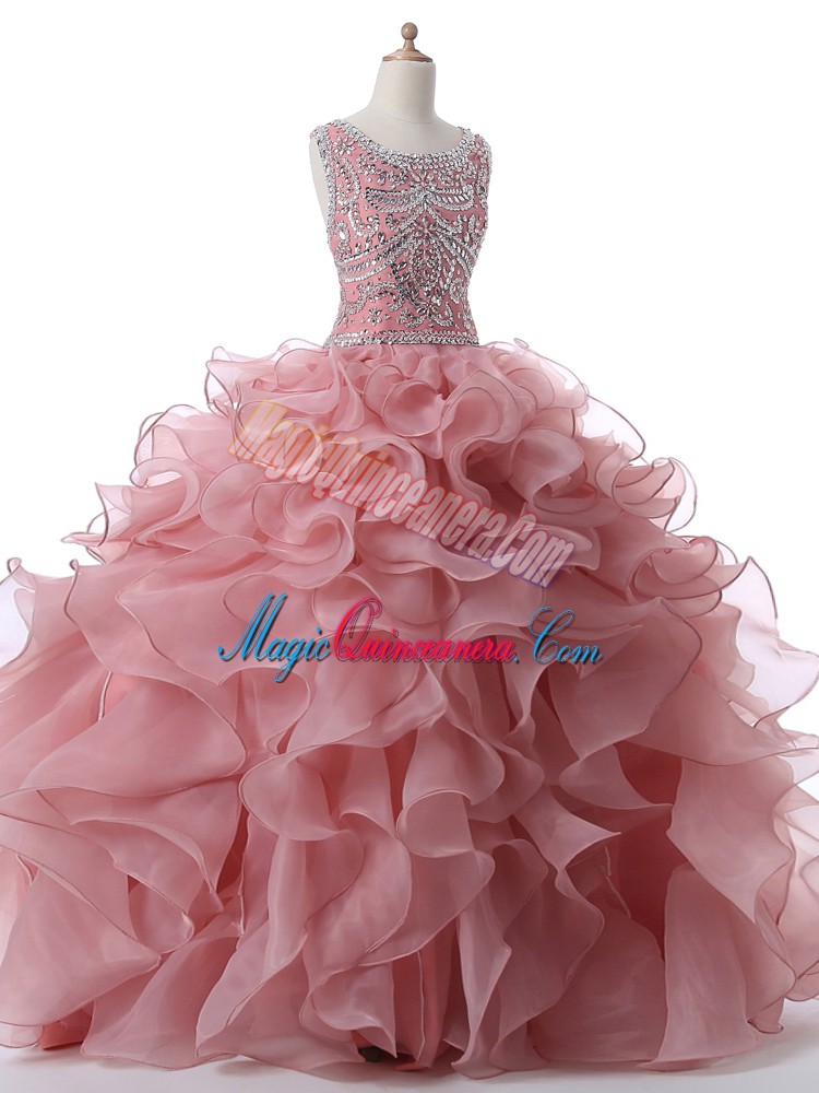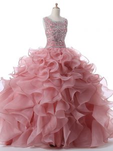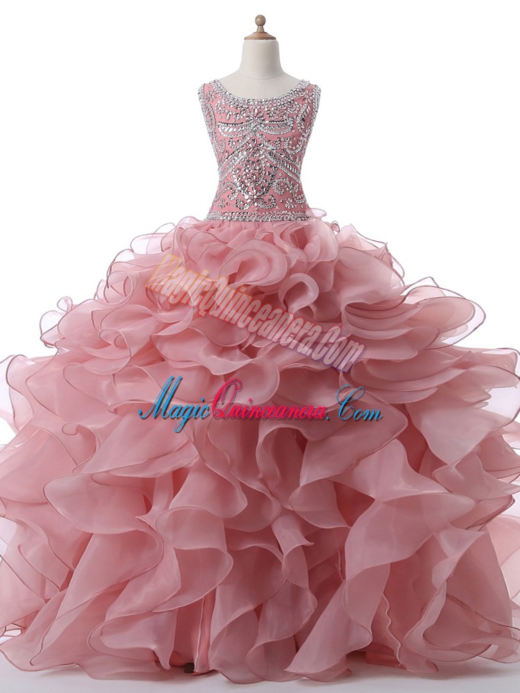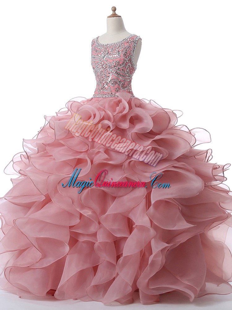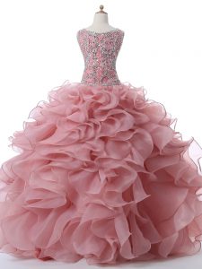 Pink Ball Gowns Organza Scoop Sleeveless Beading and Ruffles Floor Length Zipper Quince Ball Gowns