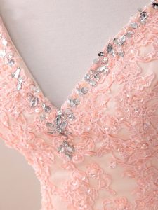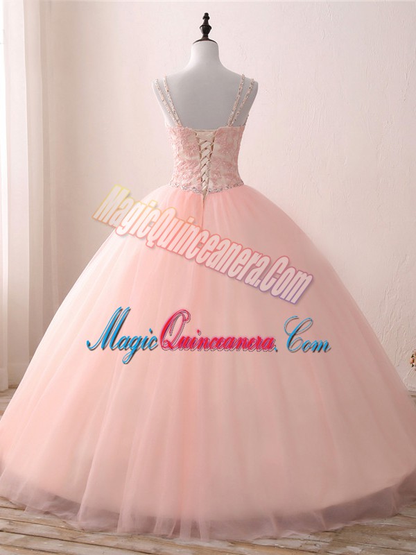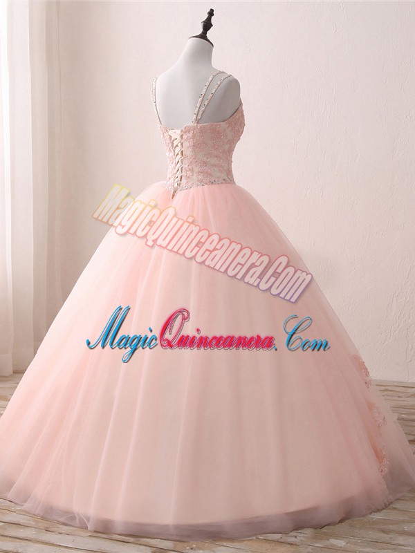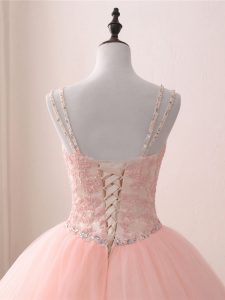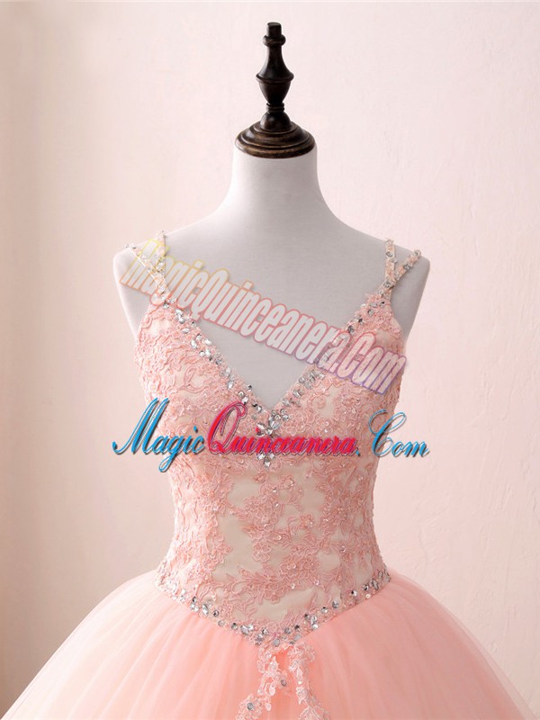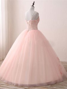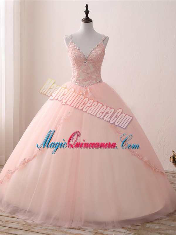 Pink Ball Gowns V-neck Sleeveless Tulle Floor Length Lace Up Beading and Appliques Quinceanera Gowns