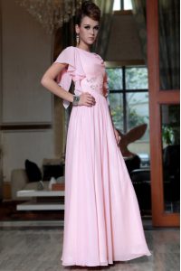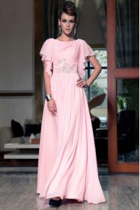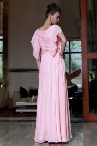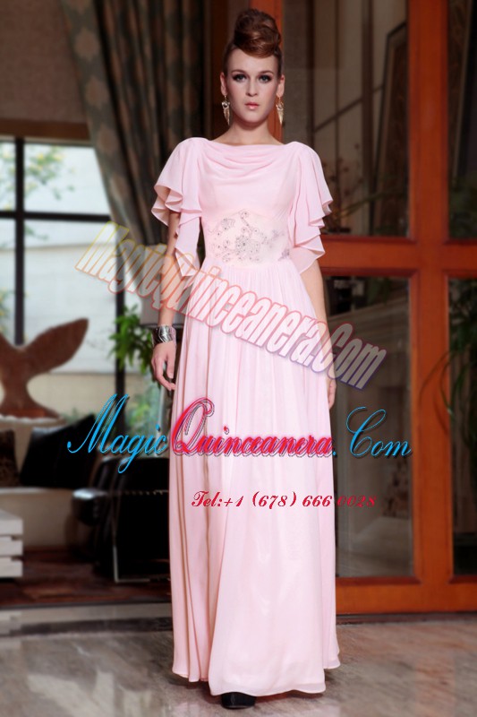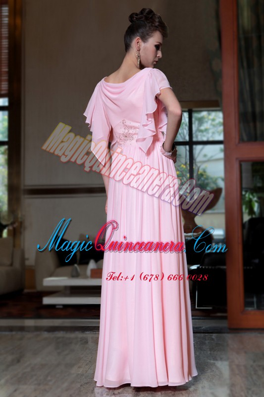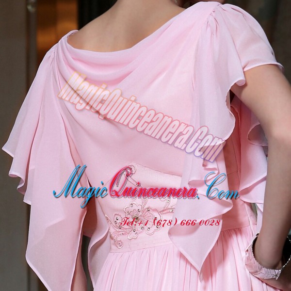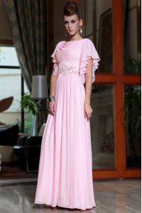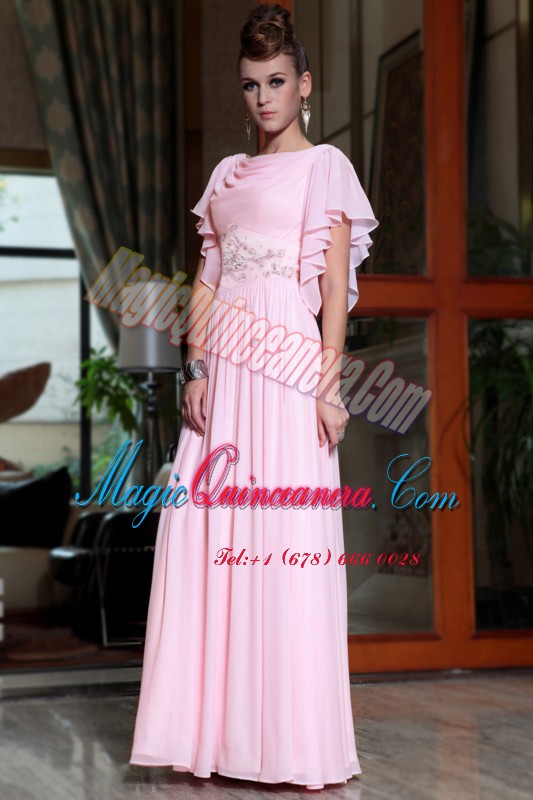 Pink Chiffon Side Zipper Bateau Cap Sleeves Ankle Length Prom Party Dress Beading and Ruching