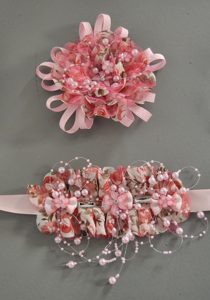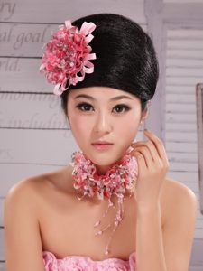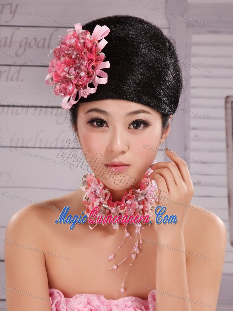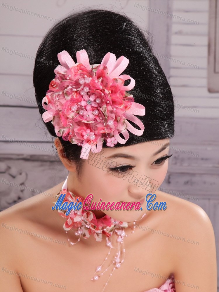 Pink Satin Ribbon and Net Flower With Pearls For Party