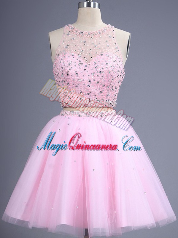 , Pink Tulle Zipper Vestidos de Damas Sleeveless Knee Length Beading and Lace
