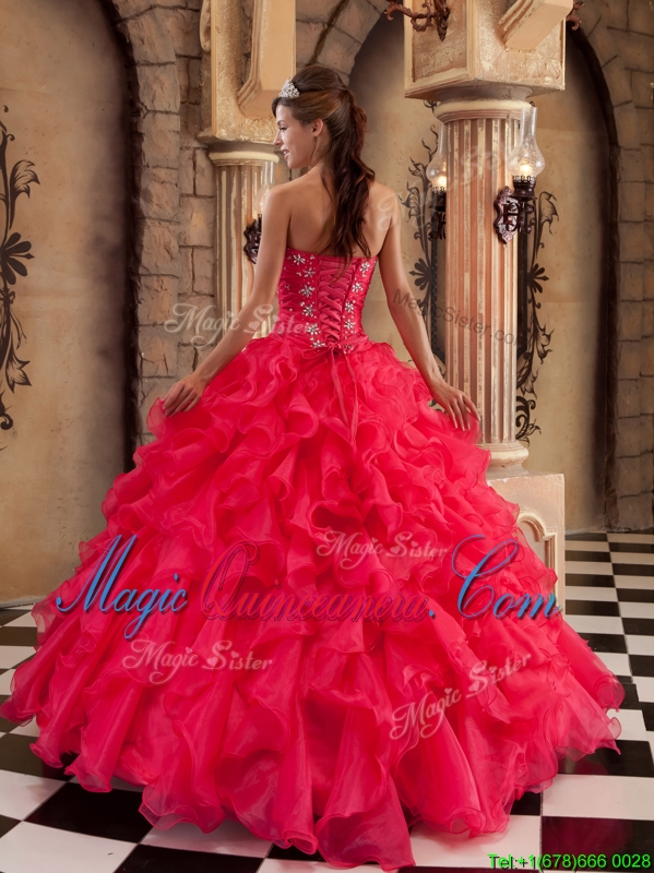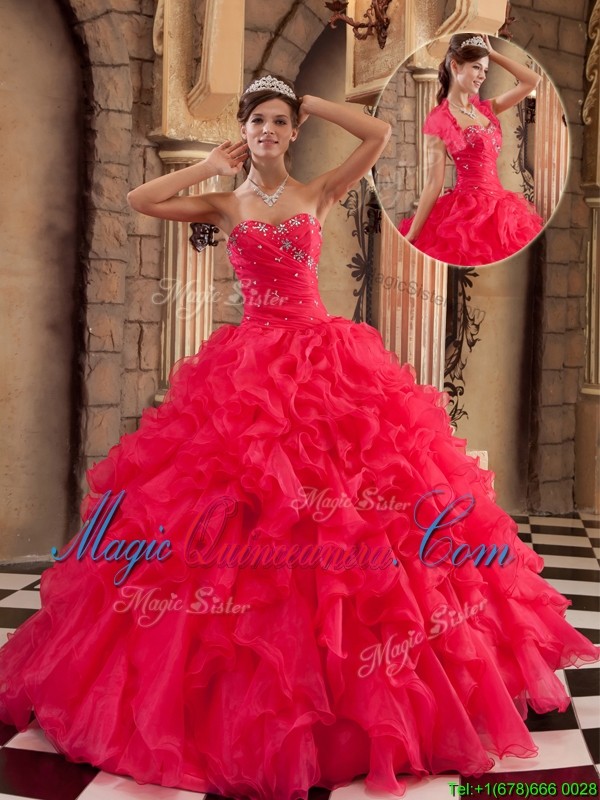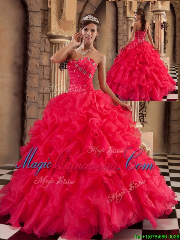 Popular Coral Red Sweetheart Quinceanera Gowns with Beading