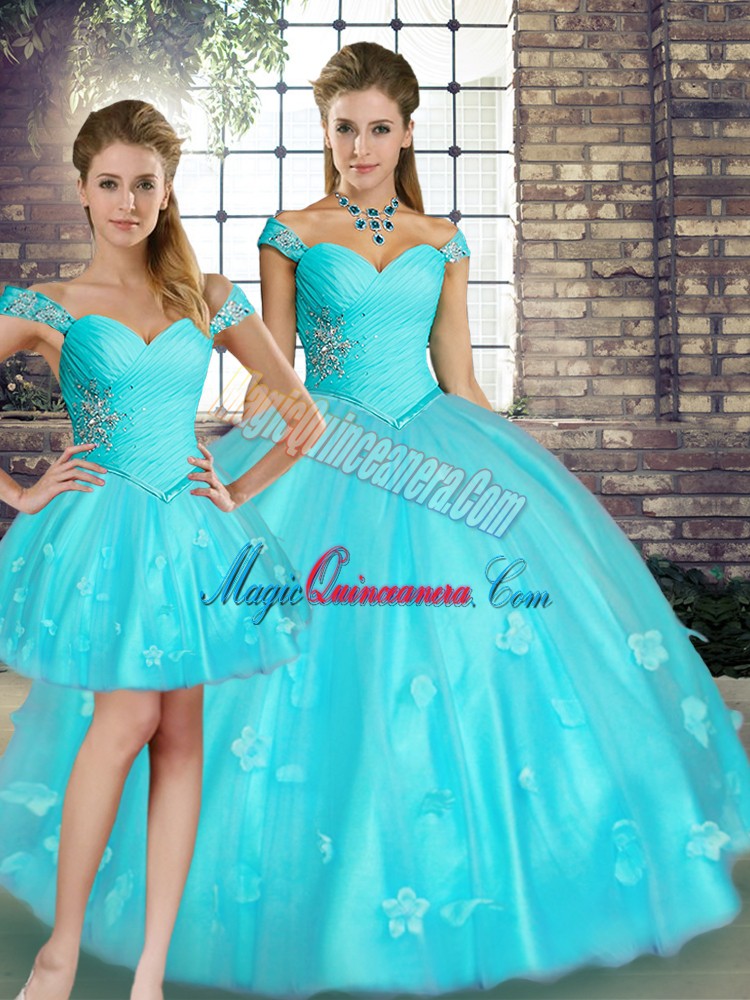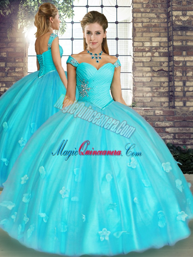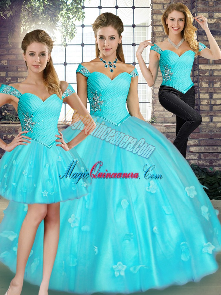 , Popular Floor Length Aqua Blue Quinceanera Gown Off The Shoulder Sleeveless Lace Up