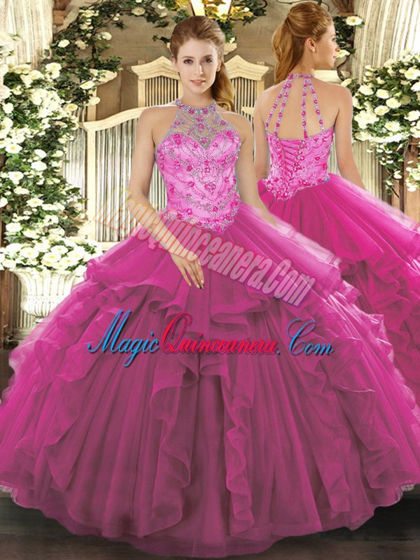 Popular Fuchsia Ball Gowns Beading Ball Gown Prom Dress Lace Up Organza Sleeveless Floor Length