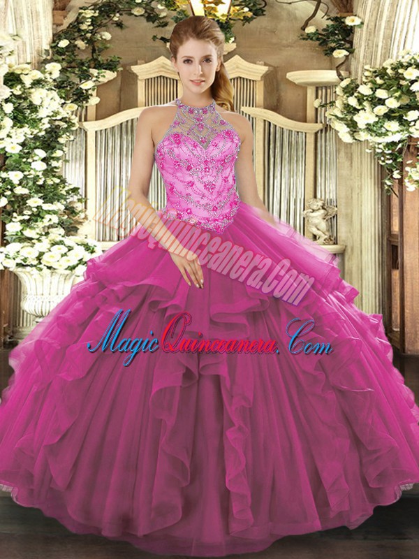Popular Fuchsia Ball Gowns Beading Ball Gown Prom Dress Lace Up Organza Sleeveless Floor Length - Magic Quinceanera