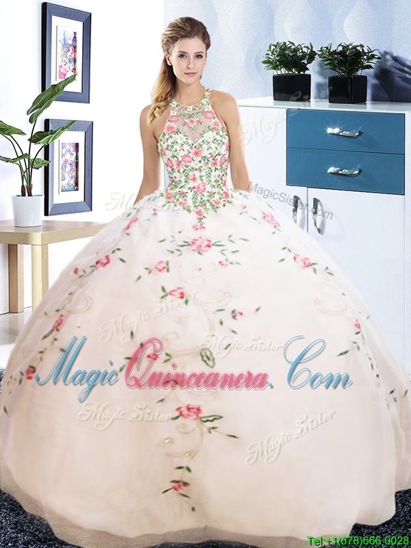 Popular Halter Top Floor Length Lace Up 15 Quinceanera Dress White and In for Military Ball and Sweet 16 and Quinceanera with Embroidery