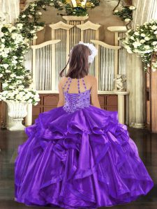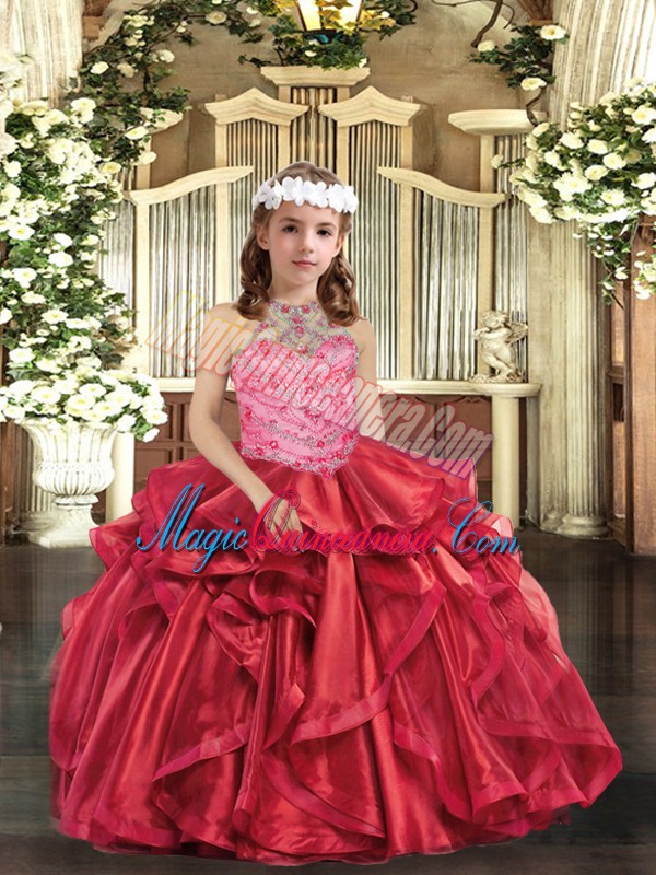 Popular Halter Top Sleeveless Pageant Gowns Floor Length Beading and Ruffles Red Organza