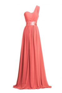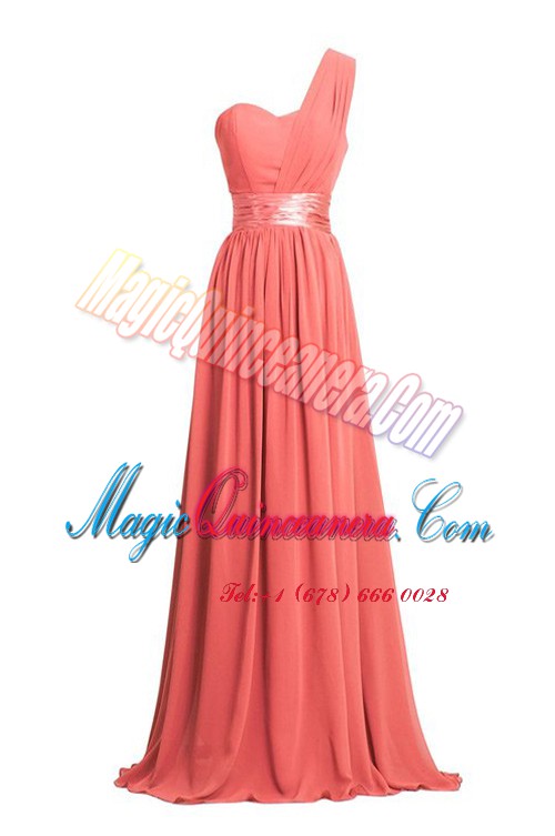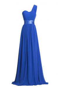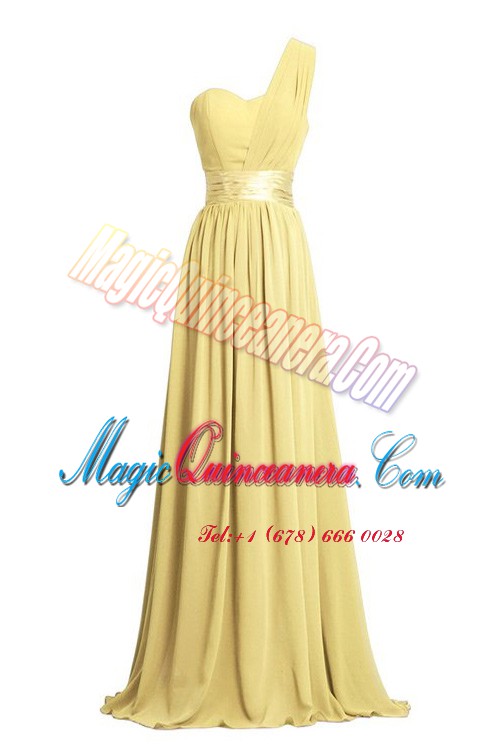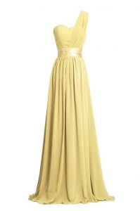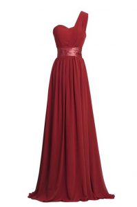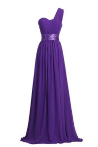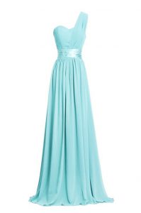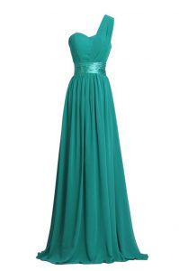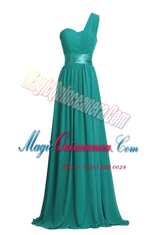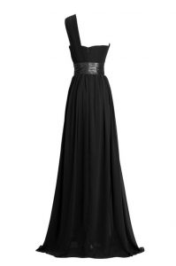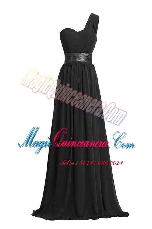 Popular One Shoulder Sleeveless Floor Length Ruching and Belt Zipper Prom Dress with Black