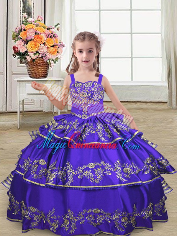 Popular Purple Sleeveless Floor Length Embroidery and Ruffled Layers Lace Up Pageant Gowns For Girls