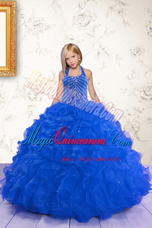 Popular Royal Blue Ball Gowns Organza Halter Top Sleeveless Beading and Ruffles Floor Length Lace Up Child Pageant Dress - Magic Quinceanera