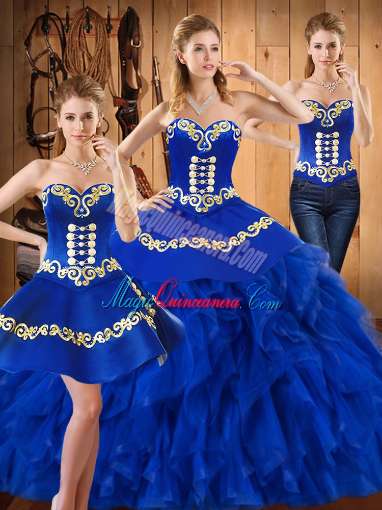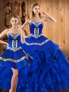 Popular Sweetheart Sleeveless Satin and Organza Ball Gown Prom Dress Embroidery and Ruffles Lace Up