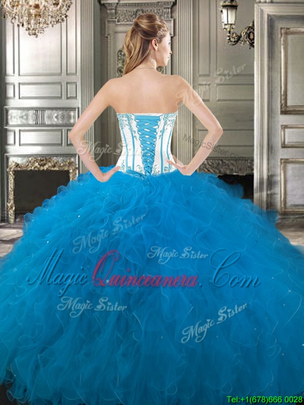Popular Three Piece Tulle Sleeveless Floor Length Quince Ball Gowns and Embroidery and Ruffles