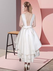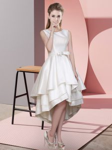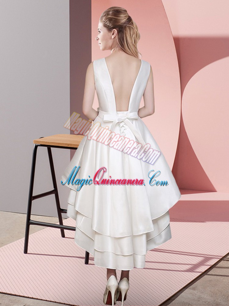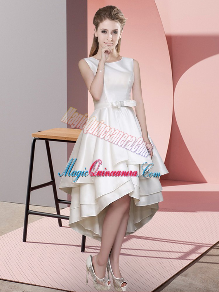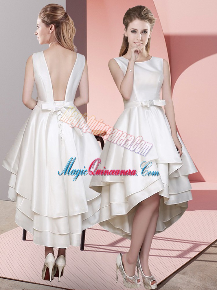 Popular White Satin Lace Up Quinceanera Dama Dress Sleeveless High Low Ruffled Layers - Magic Quinceanera