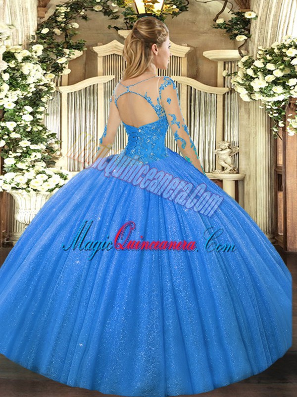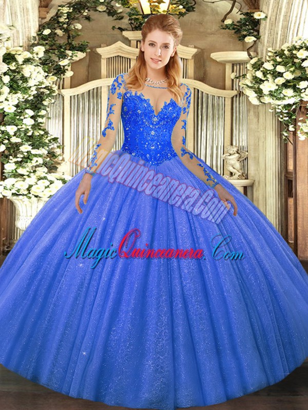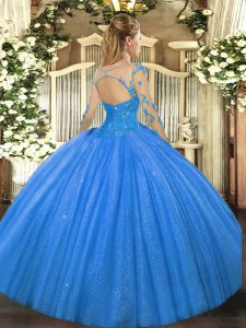 Pretty Blue Ball Gowns Tulle Scoop Long Sleeves Lace Floor Length Lace Up Vestidos de Quinceanera