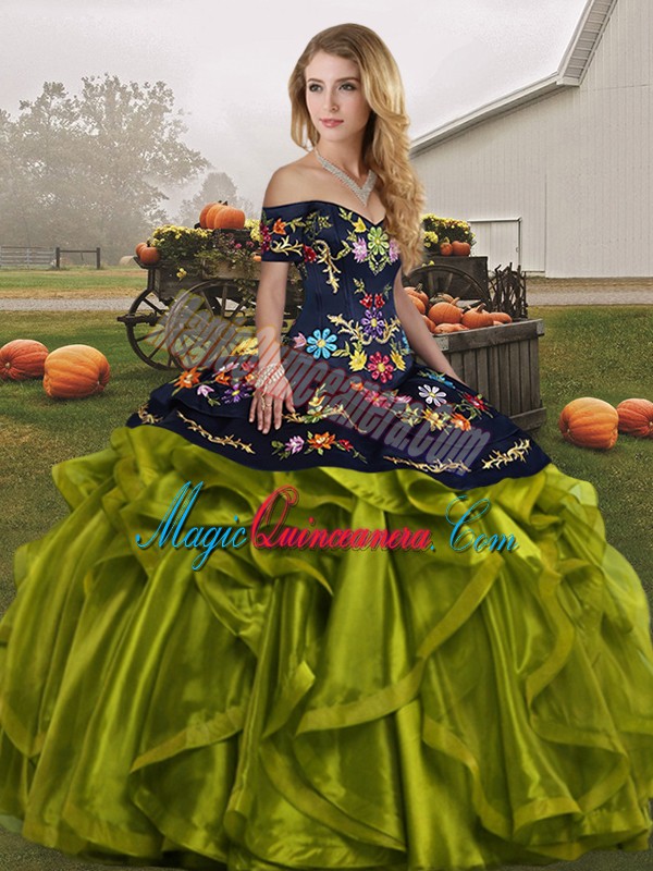 Pretty Embroidery and Ruffles Quinceanera Dress Olive Green Lace Up Sleeveless Floor Length