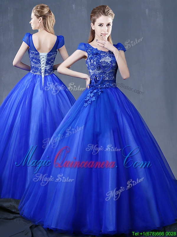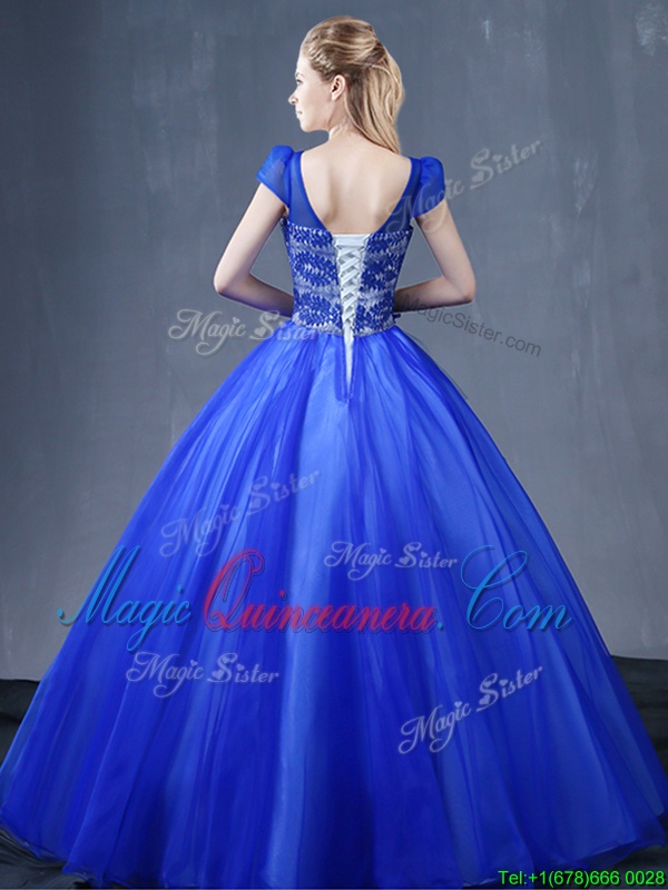 , Pretty Floor Length Ball Gowns Short Sleeves Royal Blue Sweet 16 Dress Lace Up
