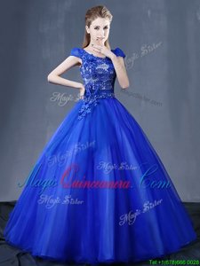 Pretty Floor Length Ball Gowns Short Sleeves Royal Blue Sweet 16 Dress Lace Up