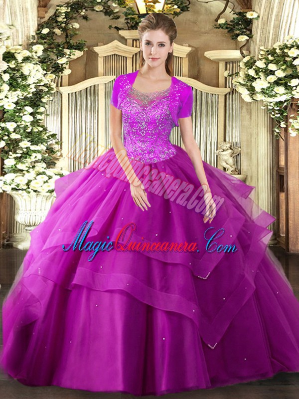 Pretty Fuchsia Ball Gowns Scoop Sleeveless Tulle Floor Length Clasp Handle Beading and Ruffles 15th Birthday Dress