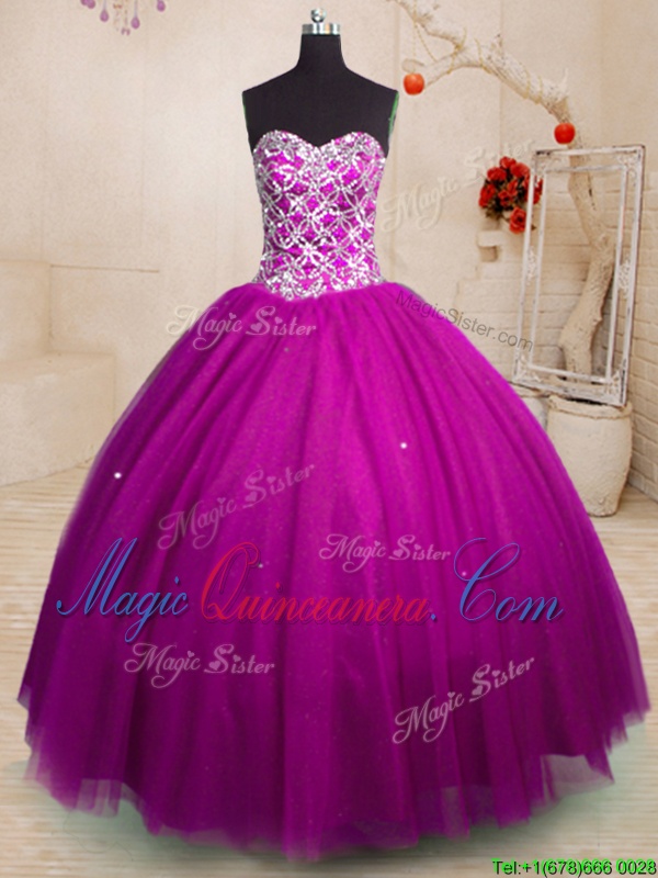 Pretty Fuchsia Ball Gowns Tulle Sweetheart Sleeveless Beading Floor Length Lace Up Sweet 16 Dresses