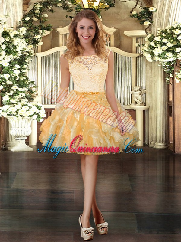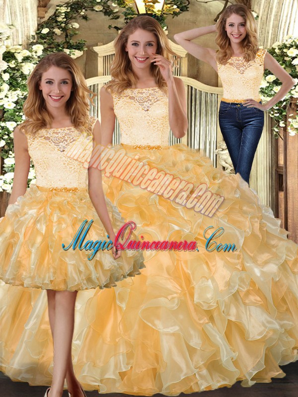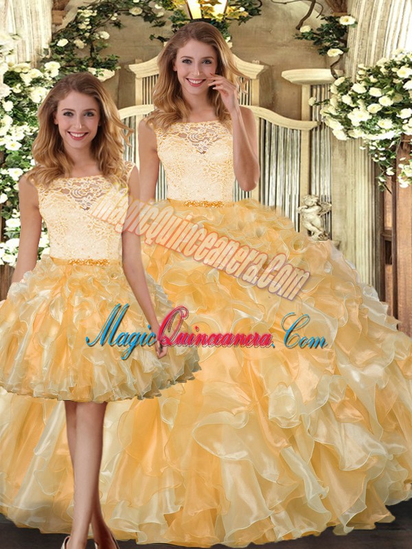 Pretty Gold Sleeveless Floor Length Lace and Ruffles Clasp Handle Quinceanera Dresses