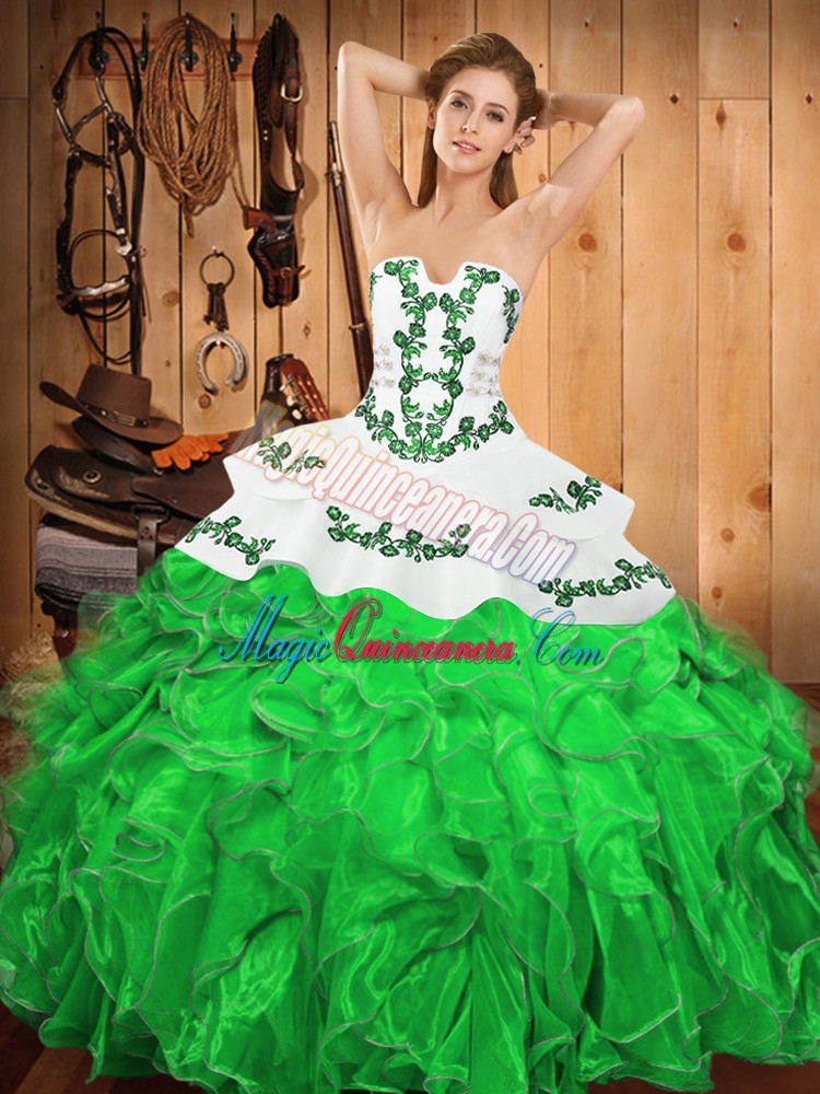 Pretty Green Ball Gowns Embroidery and Ruffles Sweet 16 Dresses Lace Up Satin and Organza Sleeveless Floor Length