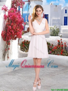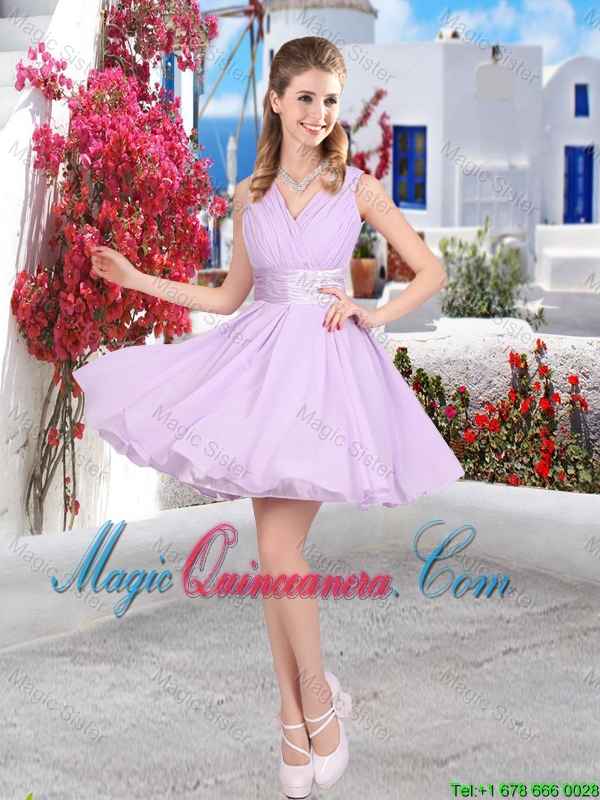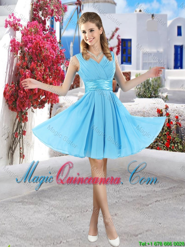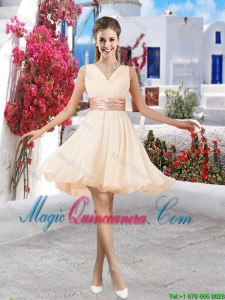 traditional zipper up dama dresses for quinceaneras, Pretty Mini Length Belt Chiffon Dama Dresses with V Neck