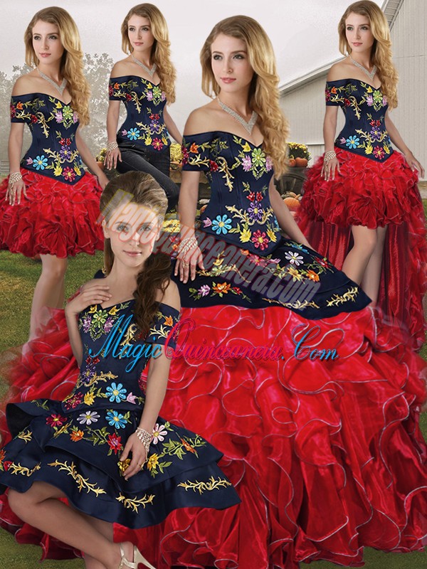 Pretty Off The Shoulder Sleeveless Vestidos de Quinceanera Floor Length Embroidery and Ruffles Red And Black Organza