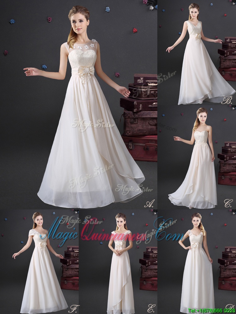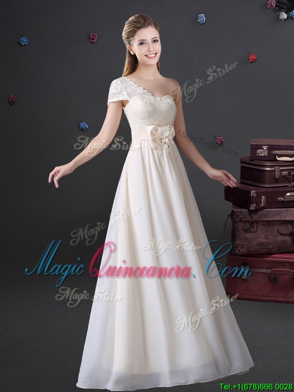 Pretty One Shoulder Floor Length White Damas Dress Chiffon Sleeveless Lace and Bowknot
