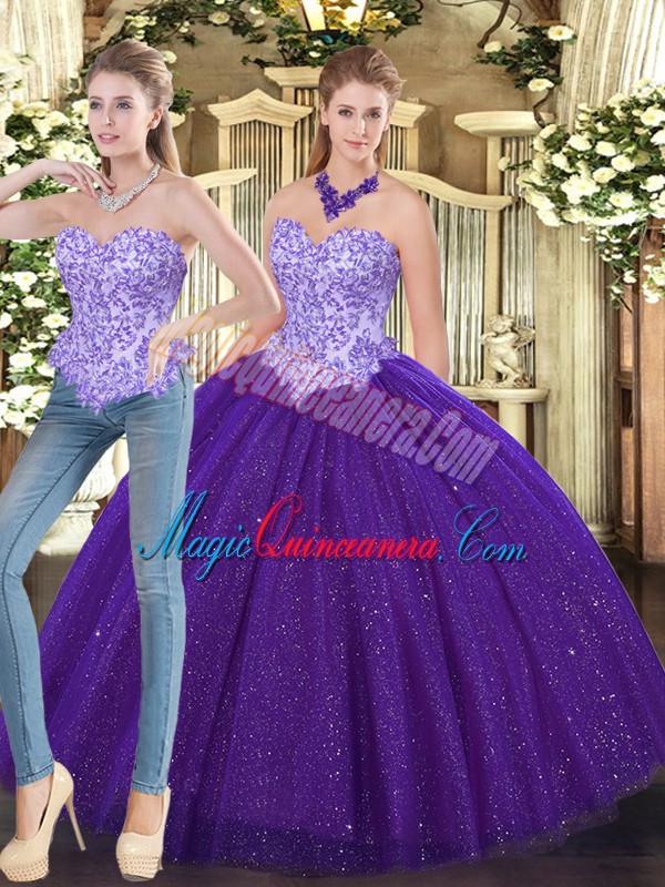 Pretty Purple Tulle Lace Up Sweetheart Sleeveless Floor Length Vestidos de Quinceanera Beading