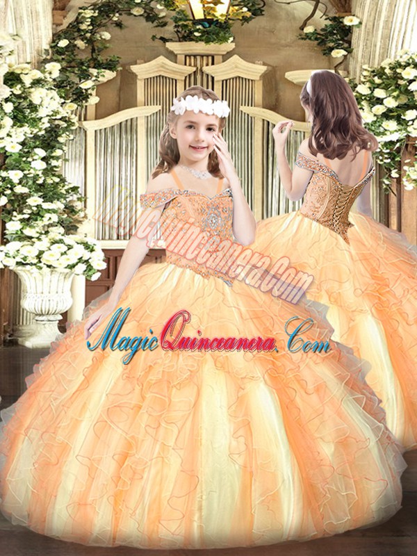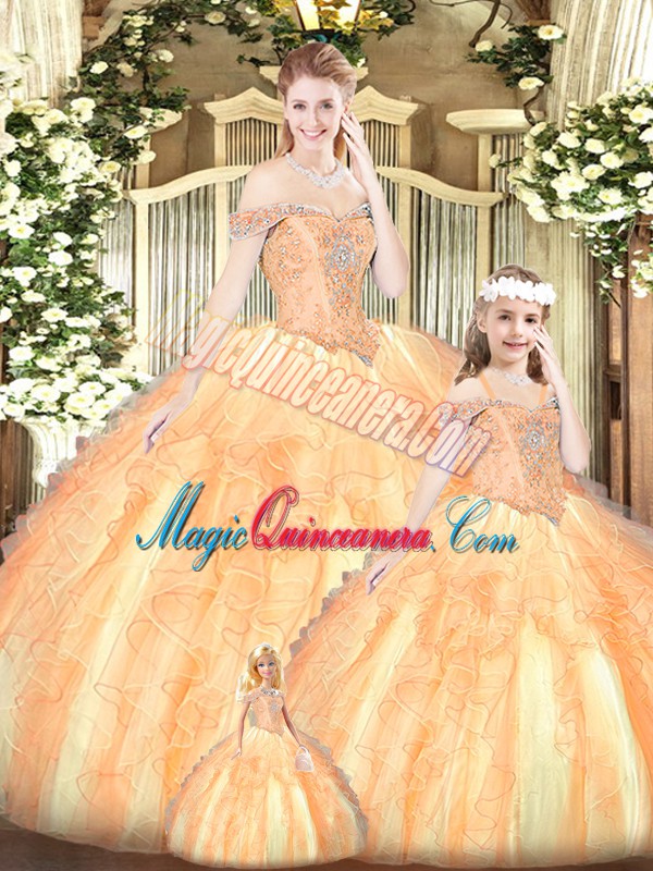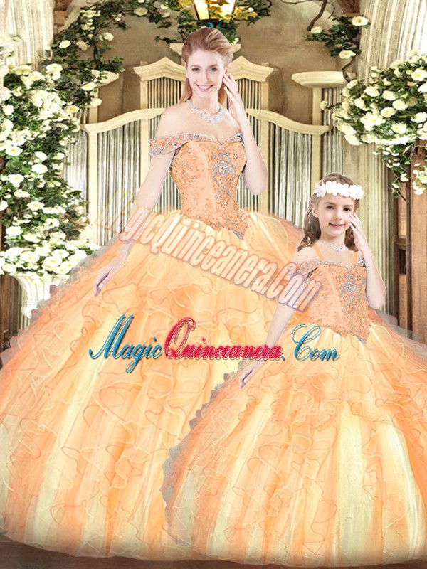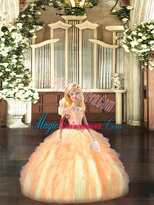 Pretty Tulle Off The Shoulder Sleeveless Lace Up Beading and Ruffles Sweet 16 Quinceanera Dress in Champagne
