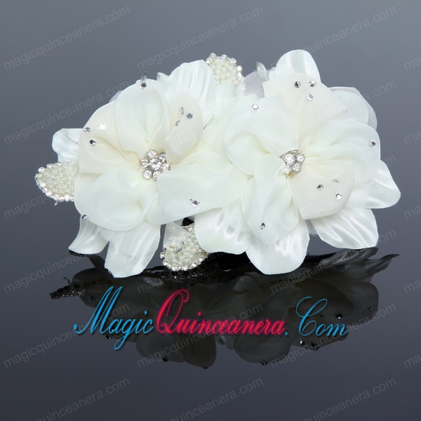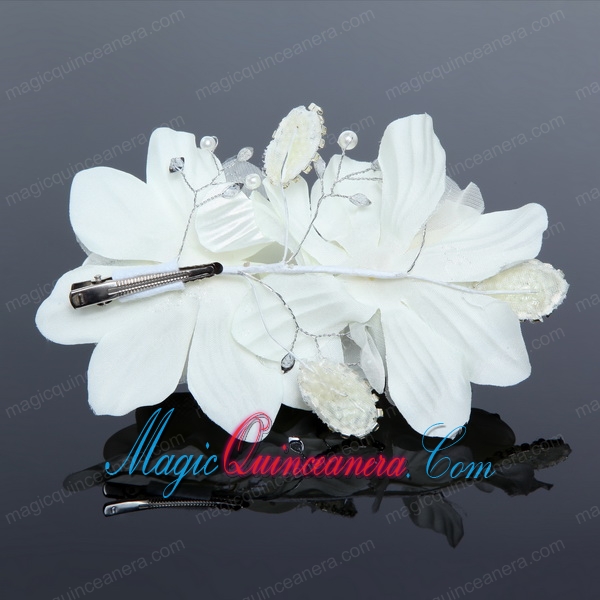 , Pretty White Tulle Imitation and Pearls Hair Flower