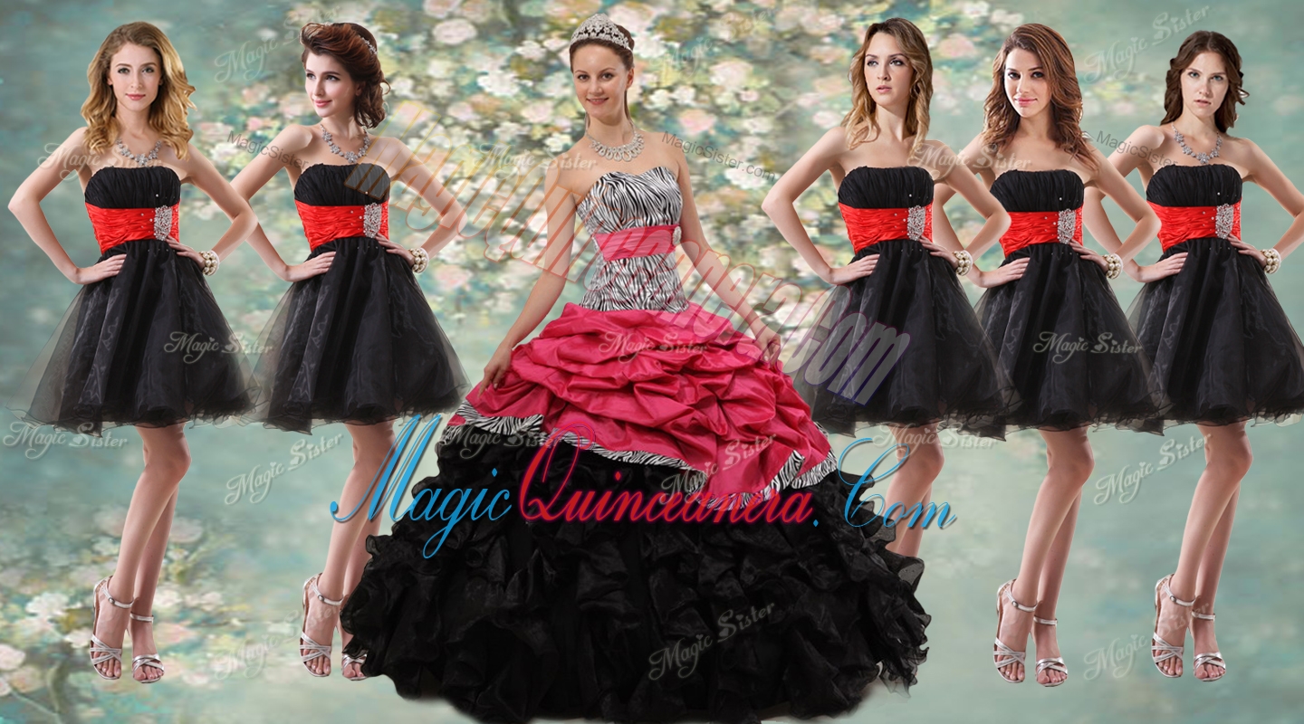 , Pretty Zebra Ruffled Red and Black Quinceanera Dress and Beaded Short Dama Dresses